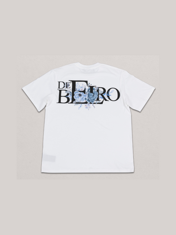 The De’Belro Floral Emblem Tee in white with blue bloom detailing offers a fresh take on luxury minimalism. Crafted from premium heavyweight cotton, it features a clean chest emblem and a bold back logo enhanced with blue floral accents, representing calm strength and individuality. A versatile luxury staple built to elevate everyday wear.